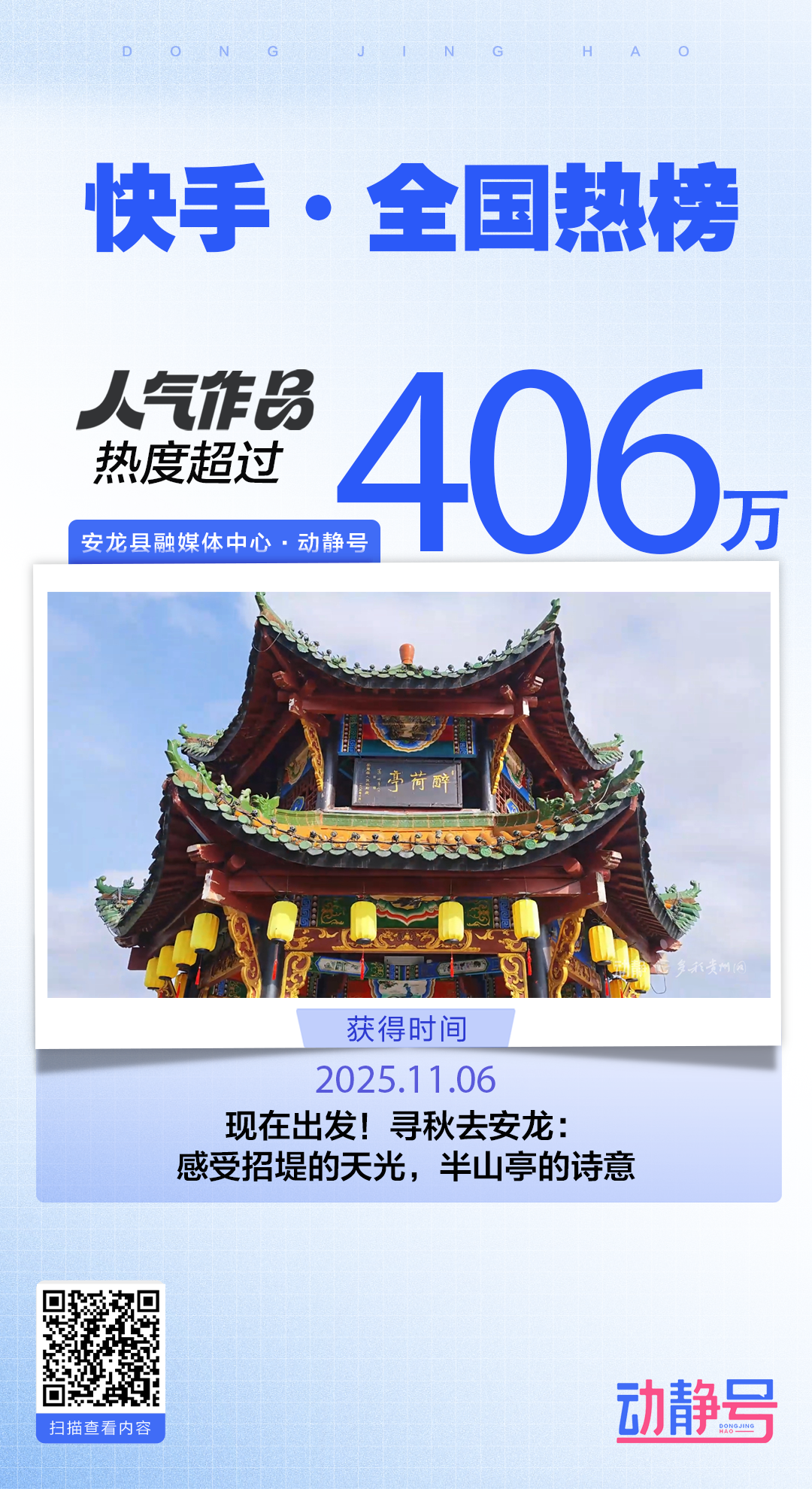▶️其中,11月6日发布秋季旅游的收官之作《现在出发!寻秋去安龙:感受招堤的天光,半山亭的诗意》(素材由安龙融媒提供),在获多家省媒转载的同时,客户端单篇阅读量达22万,相关话题更登上快手全国热榜,话题总热度突破406万。