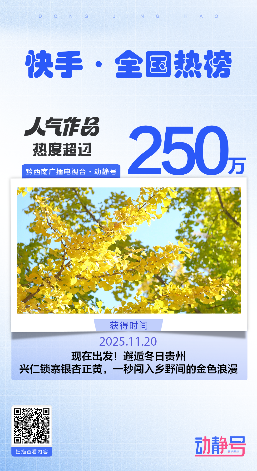 ▶️11月19日,由黔西南广播电视台提供素材制作的《现在出发!邂逅冬日贵州丨兴仁锁寨银杏正黄,一秒闯入乡野间的金色浪漫》,稿件一经发布便实现多平台覆盖,并成功登上快手全国热榜,话题热度引爆250万+。