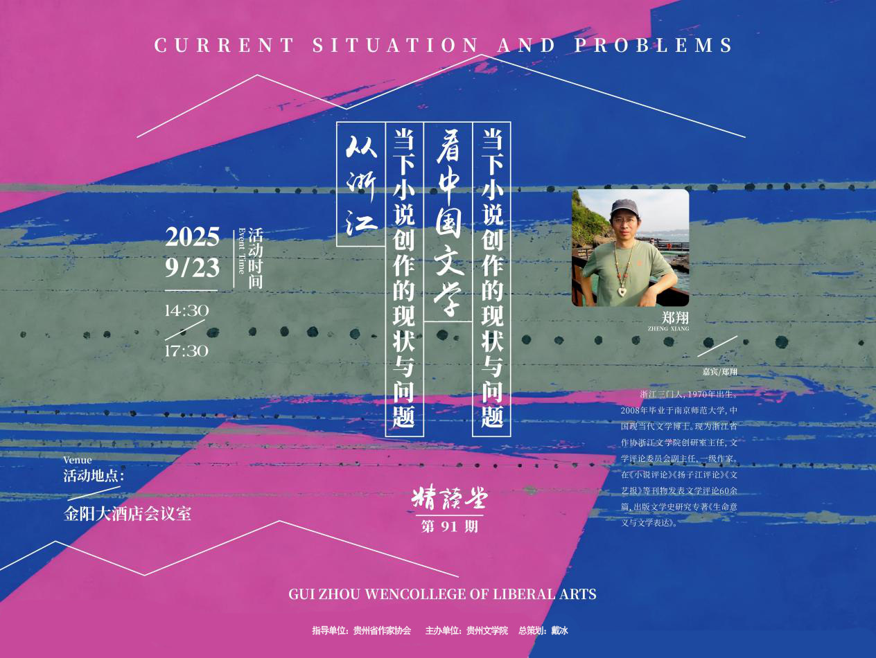 主题 从浙江当下小说创作的现状与问题看中国文学 当下小说创作的现状与问题 时 间 2025年9月23日 14:30——17:30 地 点 金阳大酒店会议室 指导单位 贵州省作家协会 主 办 贵州文学院 活动对象 广大文学爱好者 嘉宾简介 郑翔,1970年出生于浙江三门,南京师范大学中国现当代文学博士,浙江省作协浙江文学院(馆)创研宣教部前主任、浙江省作协文学评论委员会副主任,一级作家。在《南方文坛》《扬子江评论》《小说评论》《戏剧文学》《文艺报》等刊物发表文学评论60余篇,出版文学史研究专著《生命意义与文学表达》。