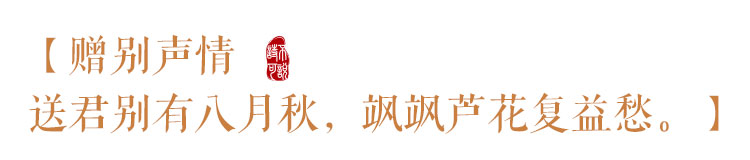 李白《黄鹤楼送孟浩然之广陵》有语,“孤帆远影碧空尽,唯见长江天际流。”他的这首诗《送别》诗则说,“云帆望远不相见,日暮长江空自流。”画面场景类似,二者情味也是一致的,都是浓情化不开,深情恰如江水流,奔涌不止,滔滔不绝。而李白《送别》诗里的“飒飒芦花”,既标明了“八月秋”的分别月令,又突出了离别之愁绪,愁上加愁,“复益愁”。