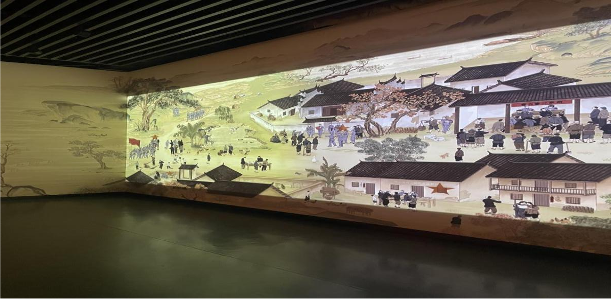 最让我印象深刻的还有AI互动墙,墙上是一个个红色故事,触碰图画上的五角星时,墙上的小人就会动起来,还有声音和台词相互配合着,让历史故事在我的眼前活灵活现。这些互动让我觉得我好像真的看到了当年的故事。