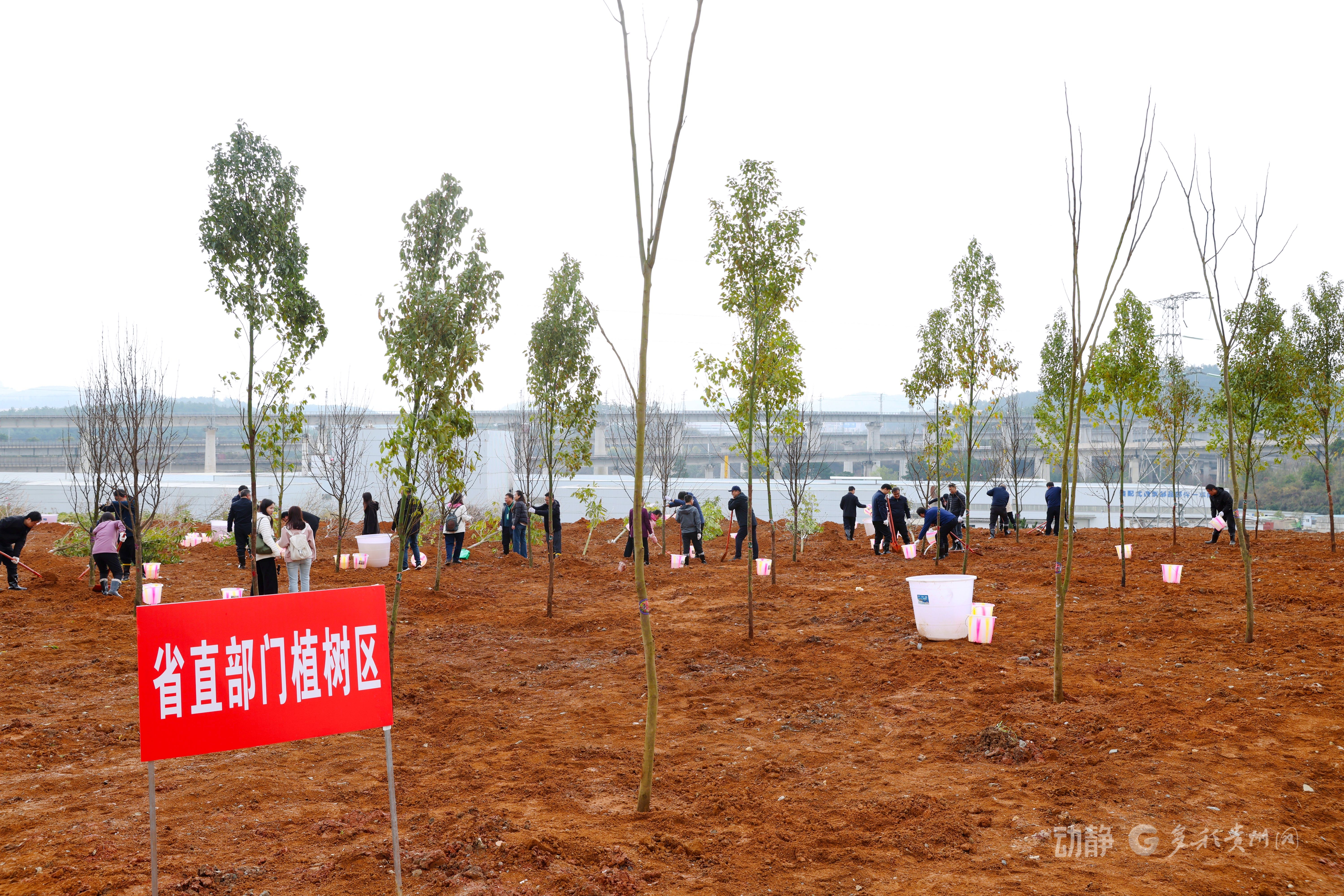 挥锹培土、挖坑植苗、提水浇灌……在贵阳市双龙航空港经济区中兴西路轻轨停保场,大家在省义务植树点参加植树活动,合力栽下香樟、栾树、樱花、红花木莲等树种,为黔贵大地再添一片盎然新绿。