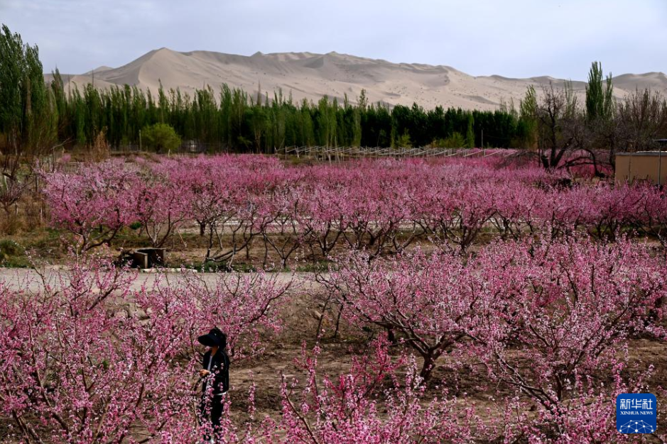日前,位于鸣沙山下的甘肃省敦煌市七里镇桃产业示范基地的桃花竞相绽放,吸引不少市民游客前来踏青赏花,乐享春光。新华社发(张晓亮摄)
