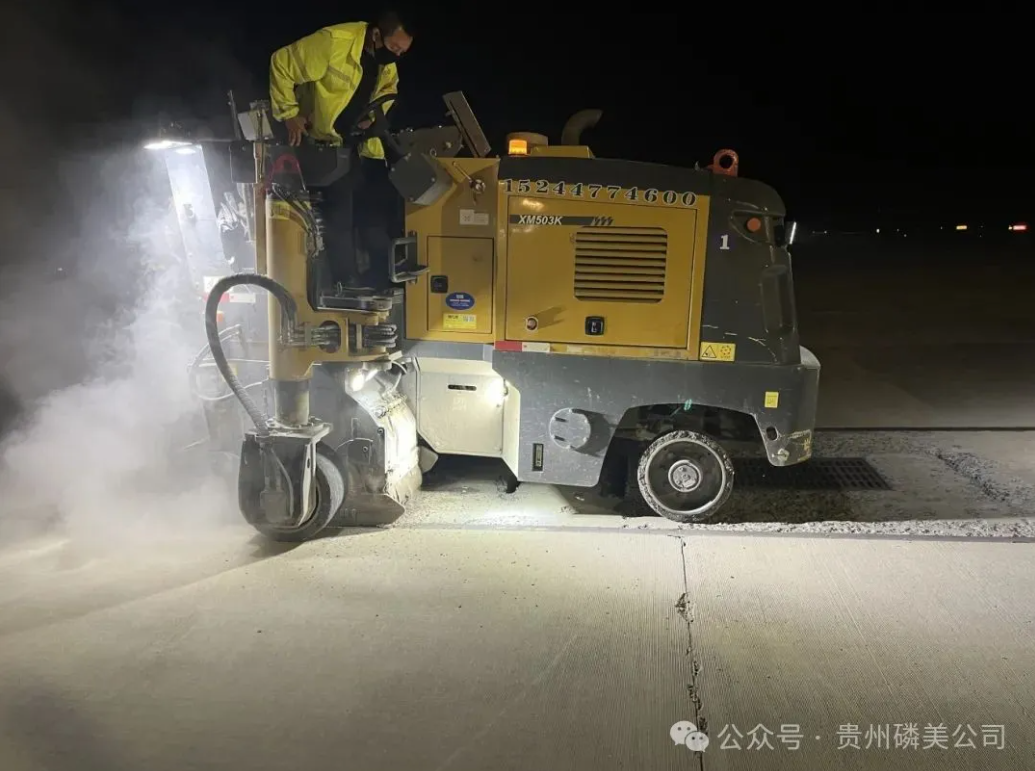 当天凌晨2时,随着最后一架航班降落,机场进入短暂停航期。磷美公司立即展开作业,1.4吨新型修补材料与专业设备同步到位。施工人员首先完成31.57平方米道面的精密铣刨,精度控制在毫米级。