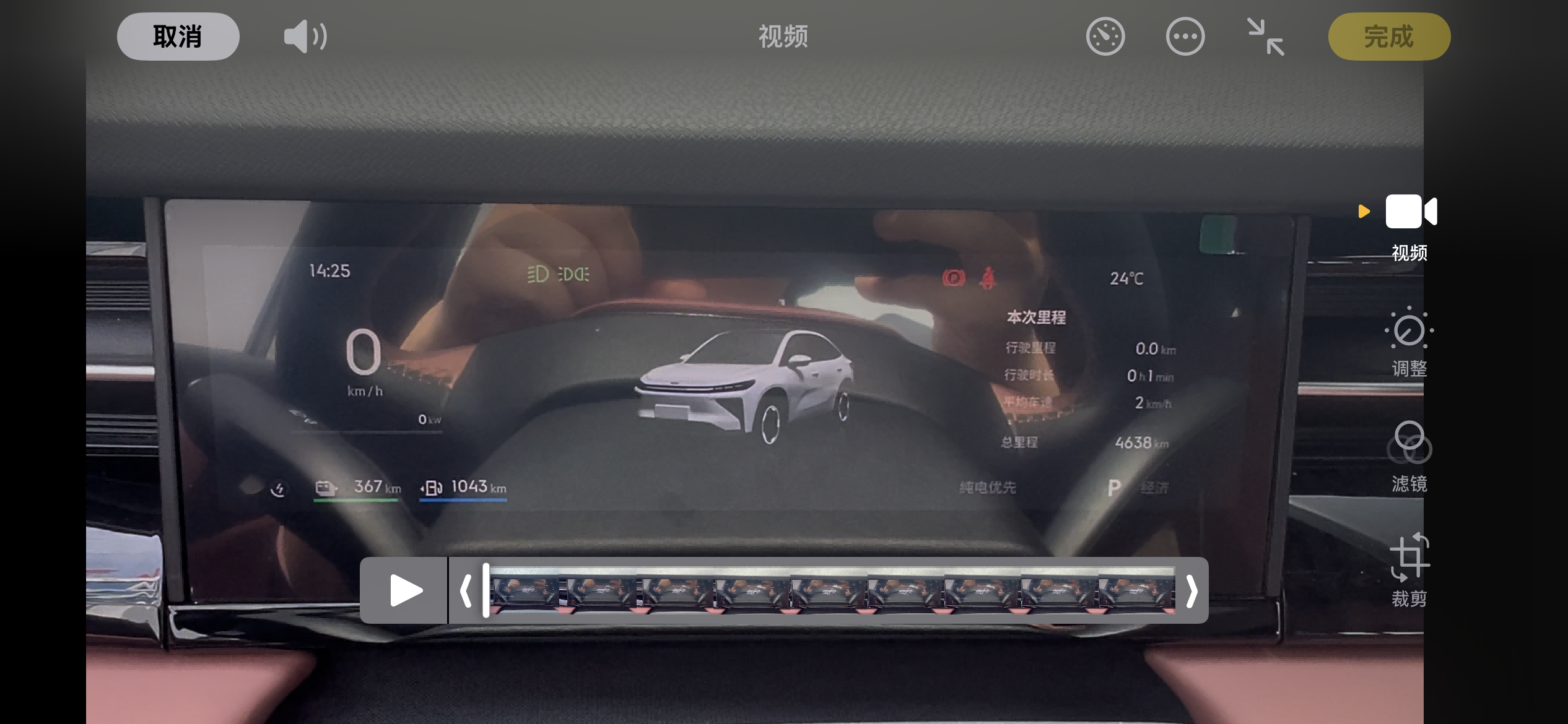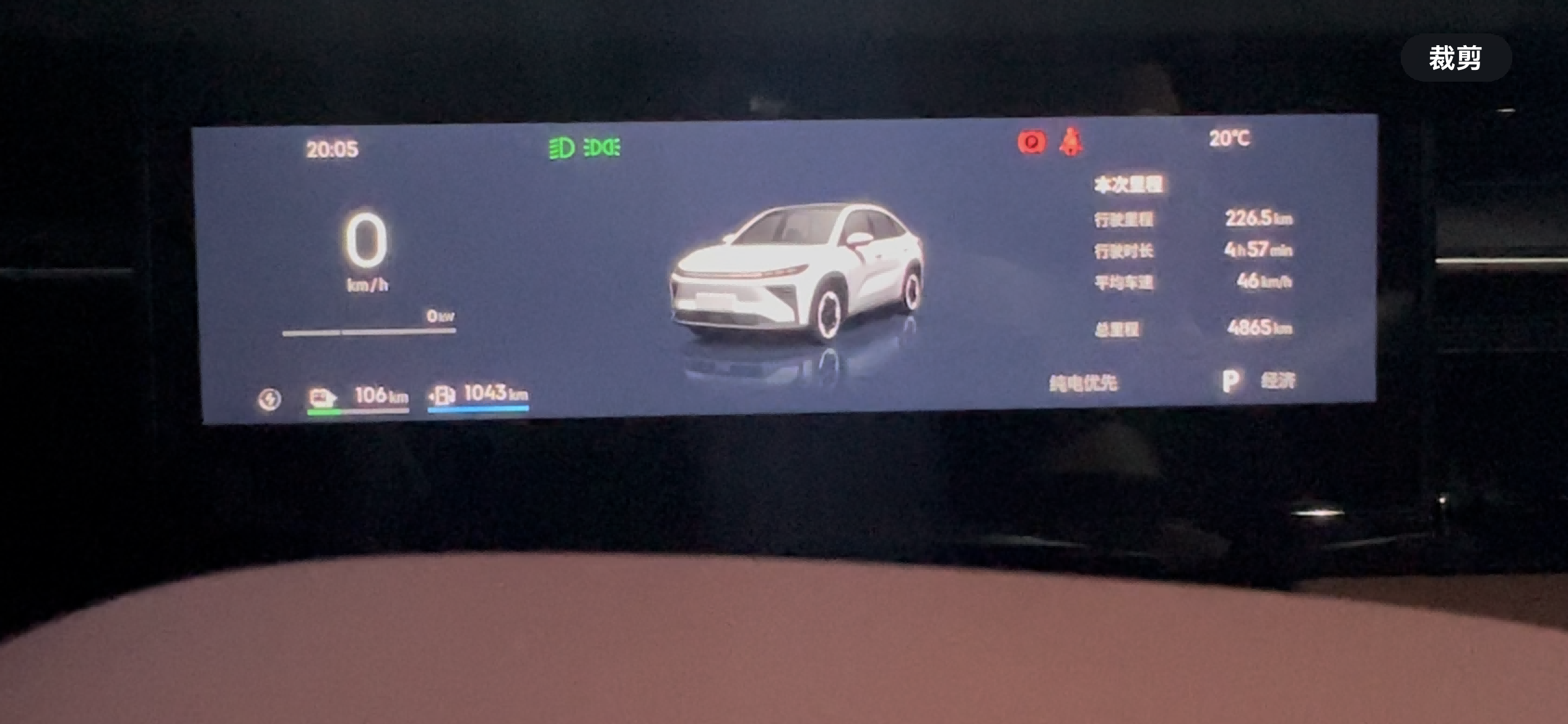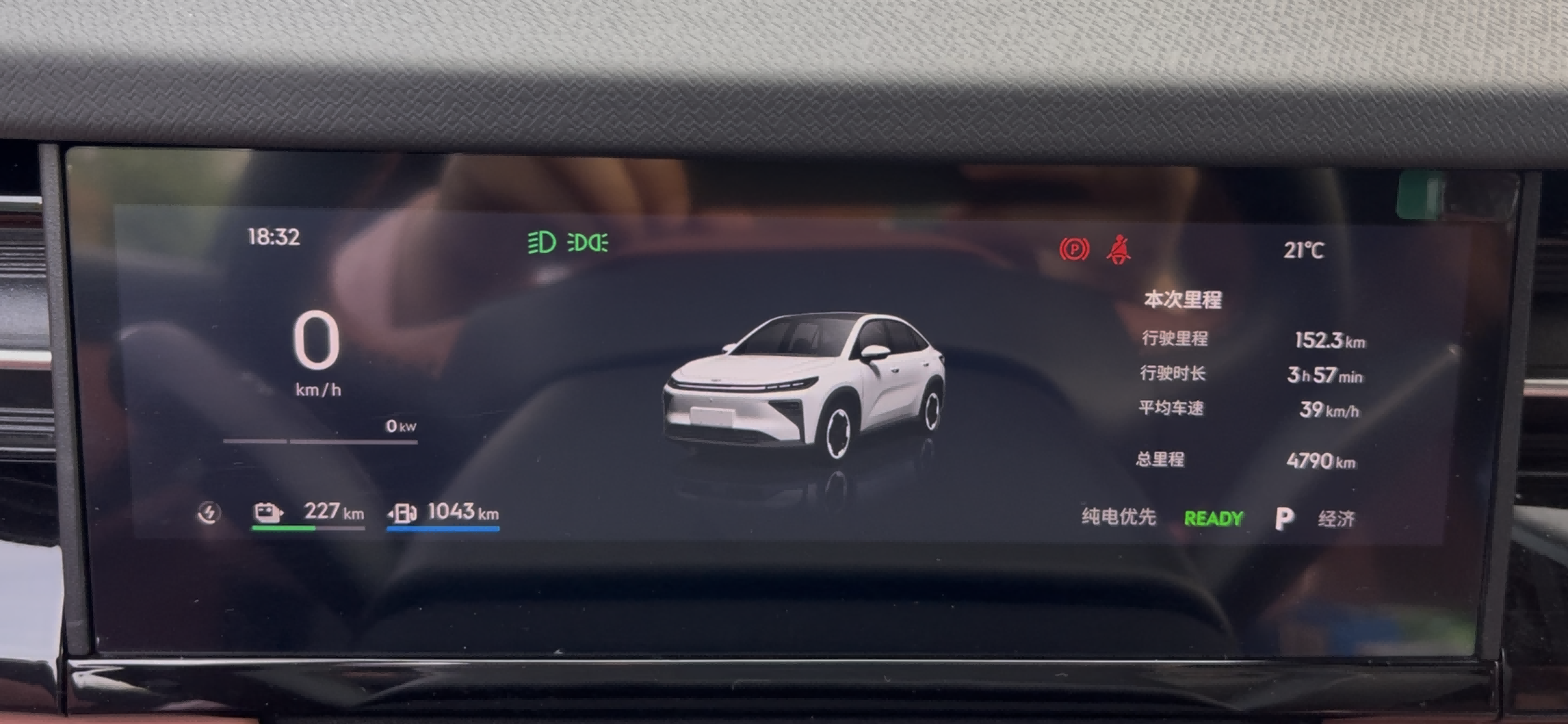 驾驶设定:纯电优先智能模式,空调24℃自动,正常使用车机、灯光、音响