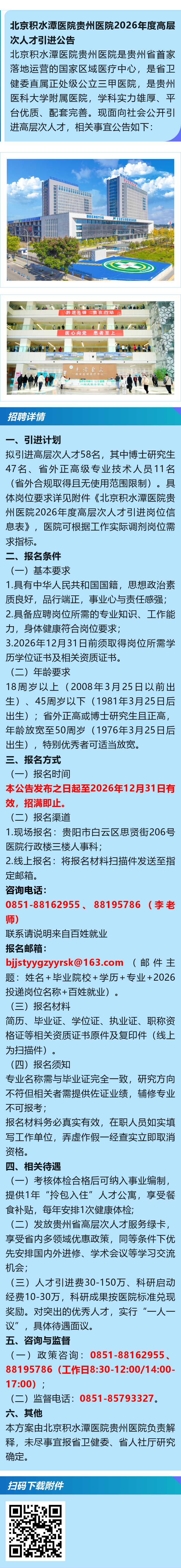 北京积水潭医院贵州医院2026年度高层次人才引进!报名截止时间:2026年12月31日!