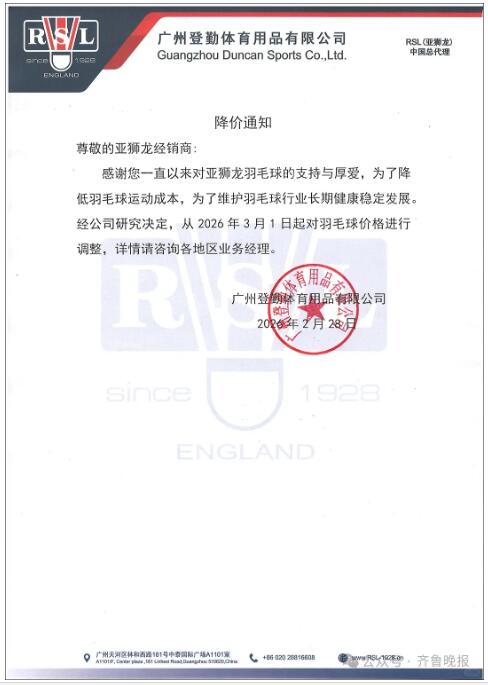 2月28日,羽毛球的龙头企业亚狮龙,也发布了降价通知。超牌、威肯……不少品牌陆续跟上降价的步伐。尤尼克斯(YONEX)至今未发布官方降价通知,但终端价格已随库存消化开始松动。