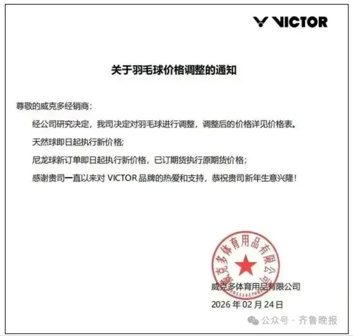 2月24日,VICTOR威克多率先宣布调价。接着斯庄格、齐克努也宣布调价,齐克努表示根据市场羽毛价格调节,公司决定对全系列羽毛球降价6元/筒。