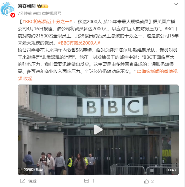 BBC将裁员近十分之一:多达2000人,系15年来最大规模裁员,为应对“巨大的财务压力”