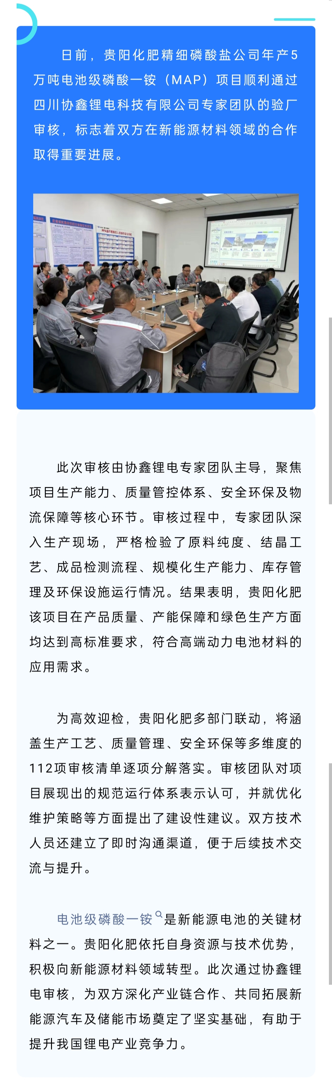 贵阳化肥5万吨电池级磷酸一铵项目通过协鑫锂电验厂审核