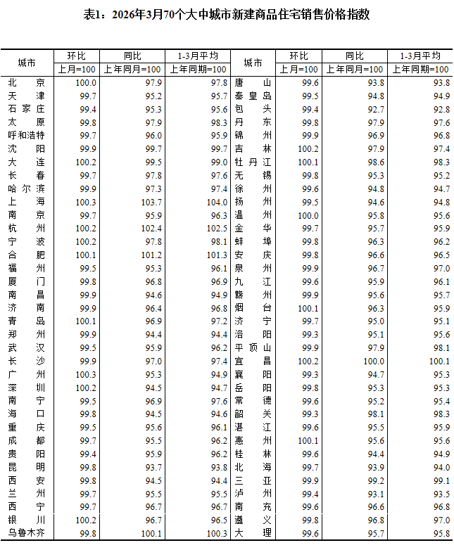国家统计局4月16日公布数据显示,2026年3月份,70个大中城市中,一线城市商品住宅销售价格环比上涨,二三线城市环比降幅收窄或相同。新建商品住宅和二手住宅销售价格环比上涨城市个数均比上月增加。