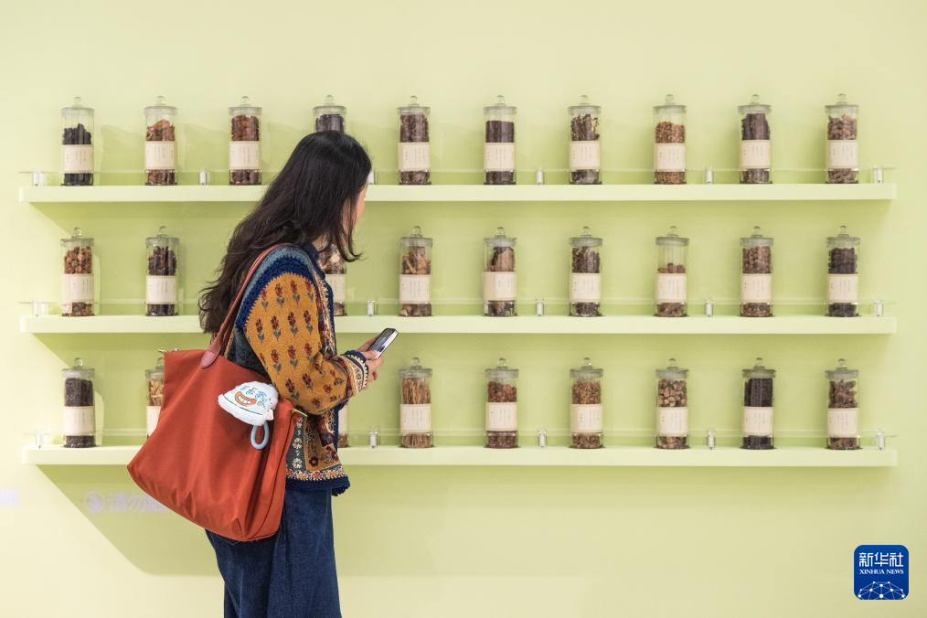 10月28日,参观者在2025年中华传统晒书活动暨长江文化典籍阅读季上观看展出的中药标本。新华社记者 肖艺九 摄
