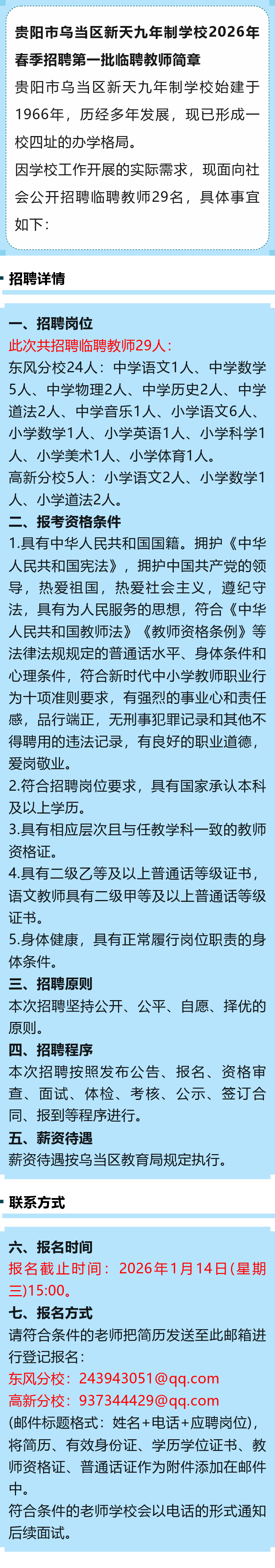 贵阳市乌当区新天九年制学校招聘!报名截止时间:2026年1月14日!