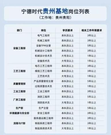 薪酬福利方面,工程师岗位综合月薪为1万元-3万元,技术员岗位综合月薪为7千元-9千元。入职后可享受全球化平台资源以及五险一金、员工宿舍等优厚待遇。但需要注意的是,本次宁德时代贵州基地招聘岗位均有学历及工作经验年限要求。