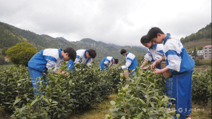 眼下正值春茶采收的季节。在贵安新区湖潮乡、铜仁市德江县、安顺市普定县,孩子们走进茶园,采茶、制茶、学习冲泡技巧,在劳动中了解茶文化。