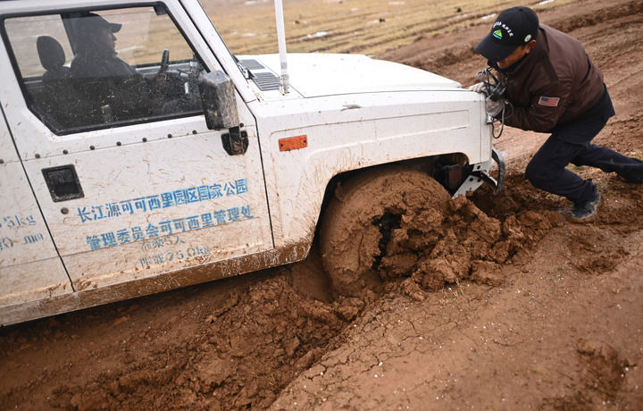 正值夏天,可可西里原本的冻土和沼泽融化成一个个烂泥滩。绞盘断了、千斤顶坏了,巡山车辆埋在泥里,动弹不得。