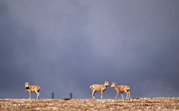 三只藏羚羊在三江源地区活动(5月28日摄)。新华社记者 张宏祥 摄