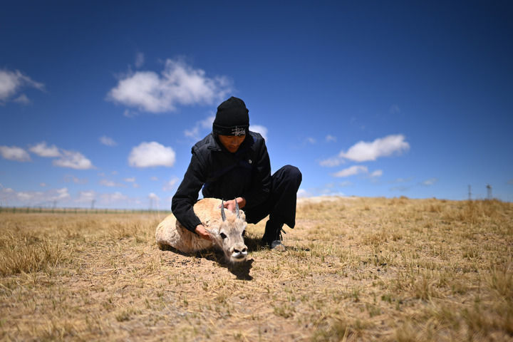 “白灵,快过来。”随着一声呼唤,一只1岁龄的雄性藏羚羊跑到巡山队员扎西桑周的身边,用长了小羊角的脑袋蹭蹭他的腿。