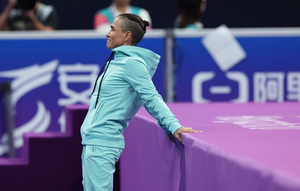 25日晚,杭州黄龙体育中心体育馆,灯若星河,人声鼎沸。48岁的丘索维金娜站在杭州亚运会体操跳马赛场,所有人目光聚焦在了她的身上。