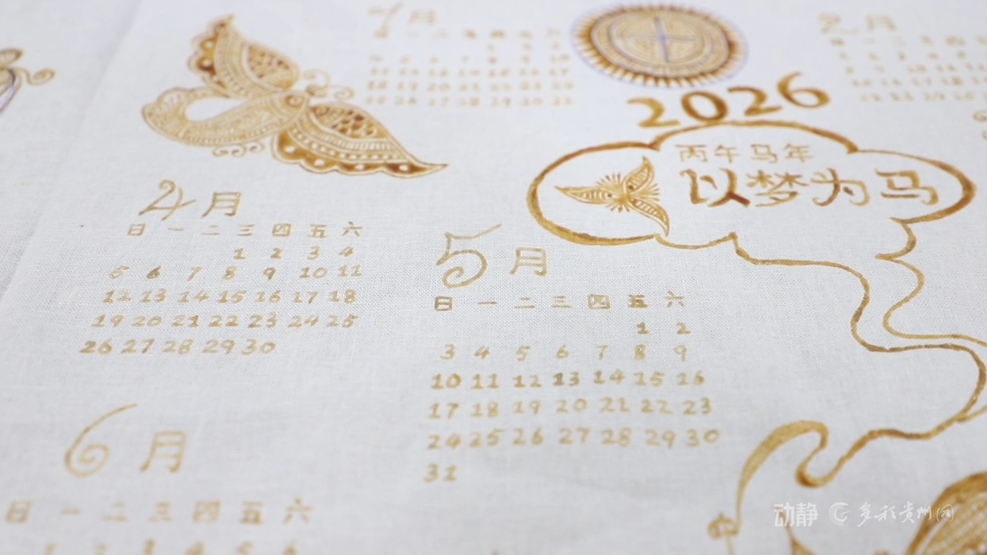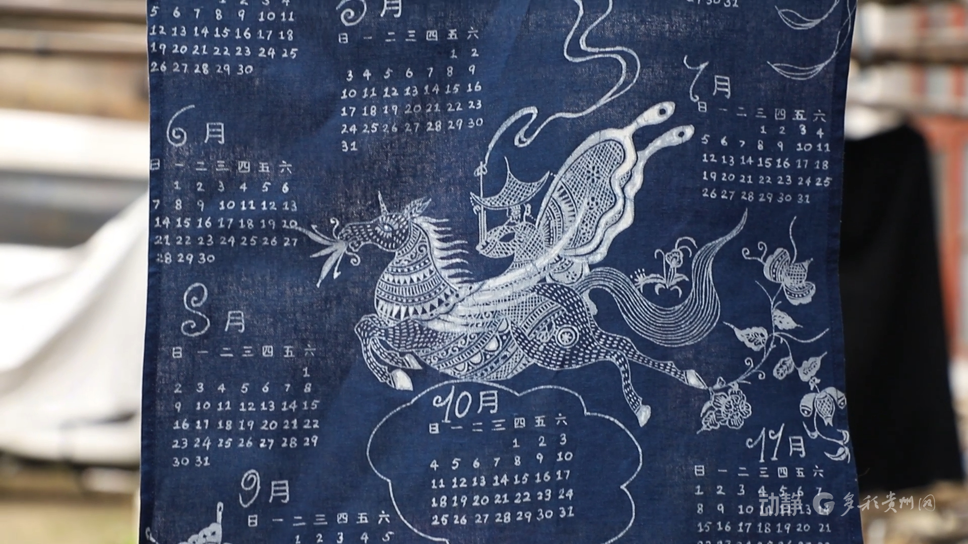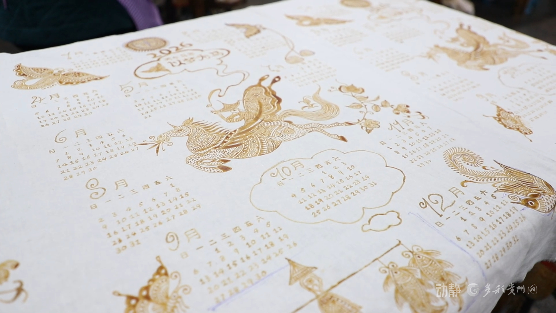 另一边的蜡染工坊里,画娘们正以蜡刀精心勾勒苗族风格的马形纹样,并将吹芦笙的人物、蝴蝶妈妈等传统文化元素融入其中,制成特色日历、装饰画、手提包等产品。这种“老手艺+新表达”的模式使工坊迎来生产高峰,新推出的日历已接获百余份订单。