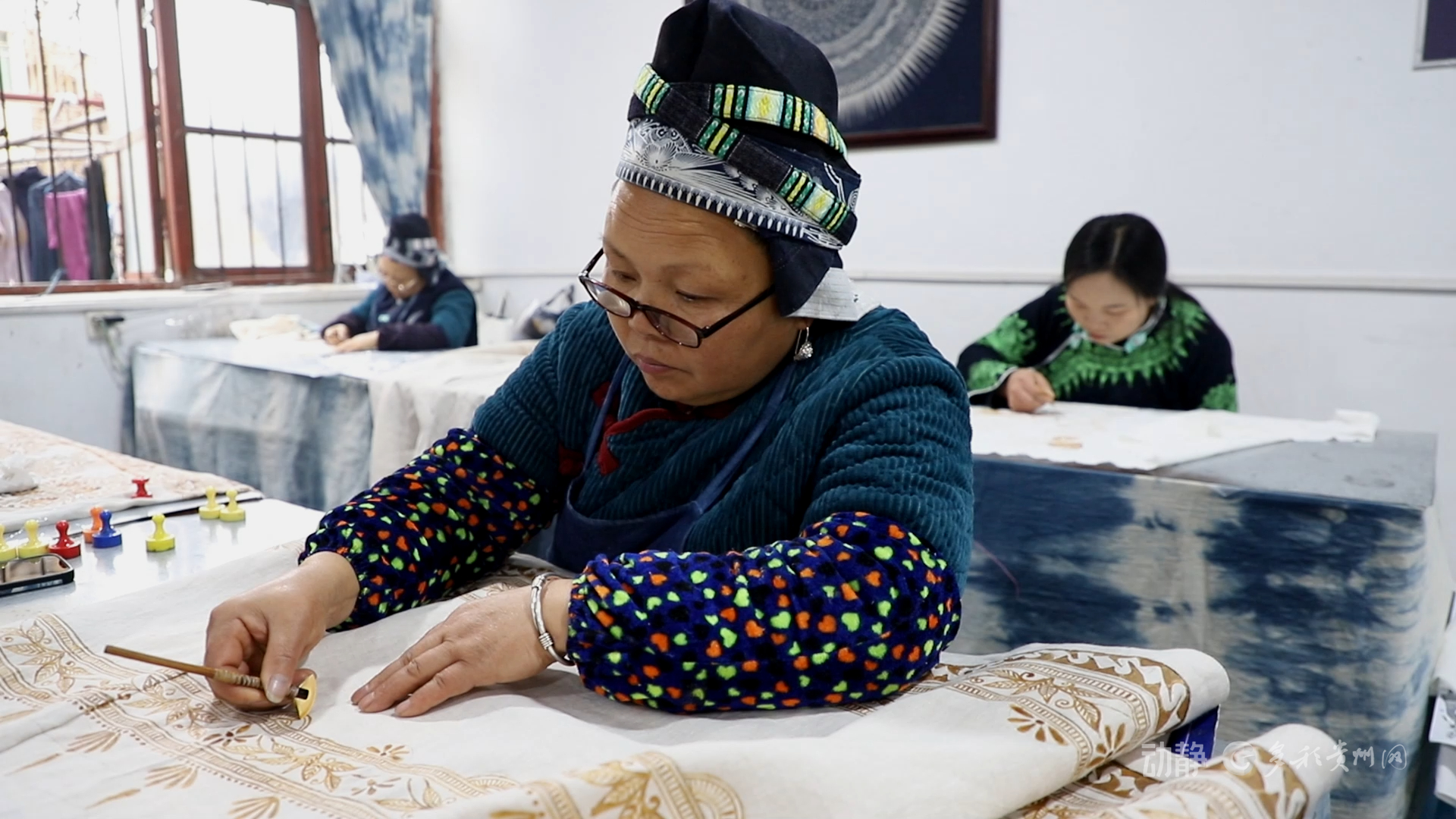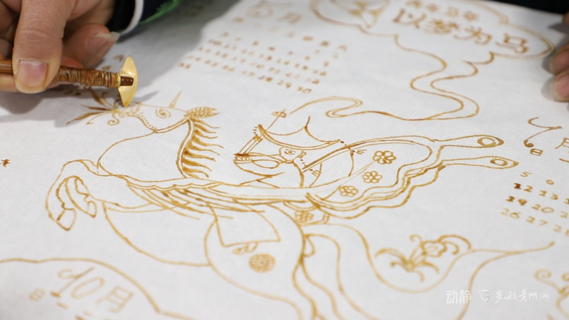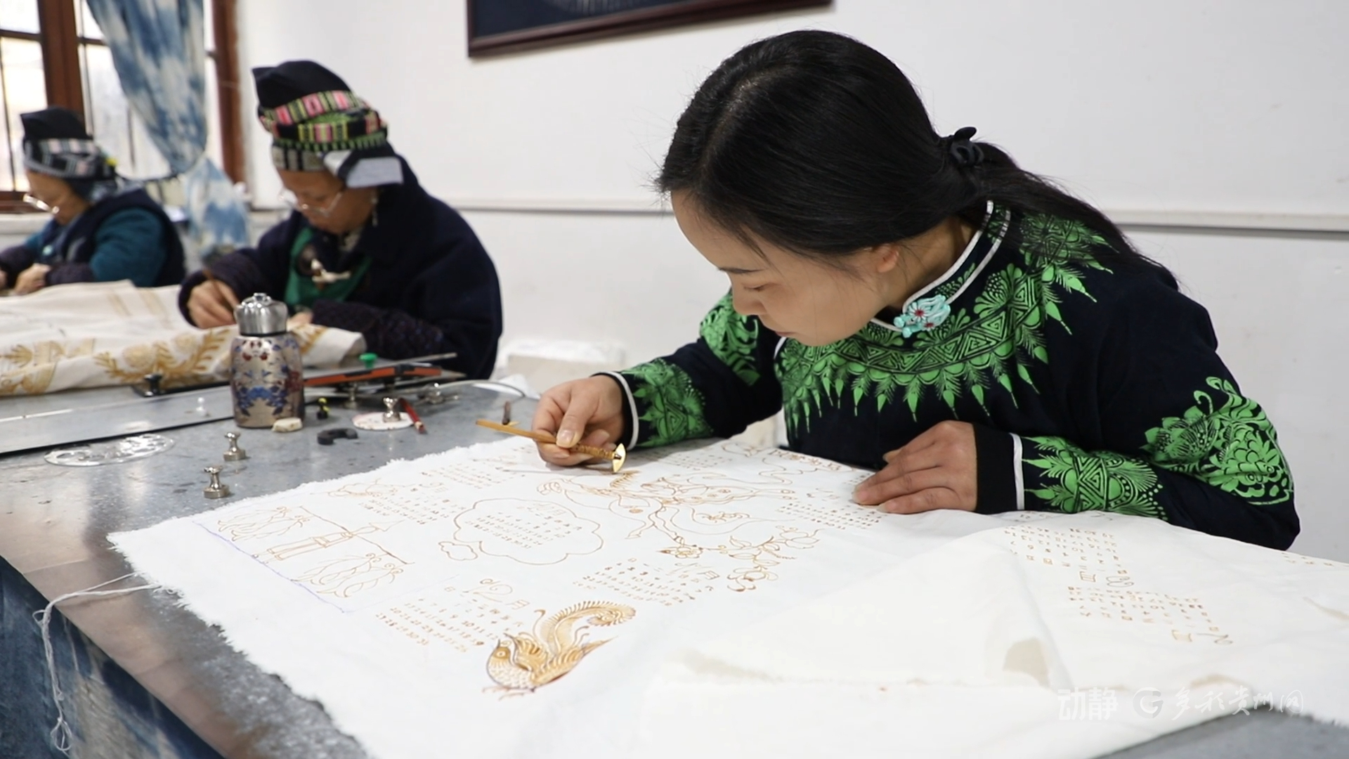 另一边的蜡染工坊里,画娘们正以蜡刀精心勾勒苗族风格的马形纹样,并将吹芦笙的人物、蝴蝶妈妈等传统文化元素融入其中,制成特色日历、装饰画、手提包等产品。这种“老手艺+新表达”的模式使工坊迎来生产高峰,新推出的日历已接获百余份订单。