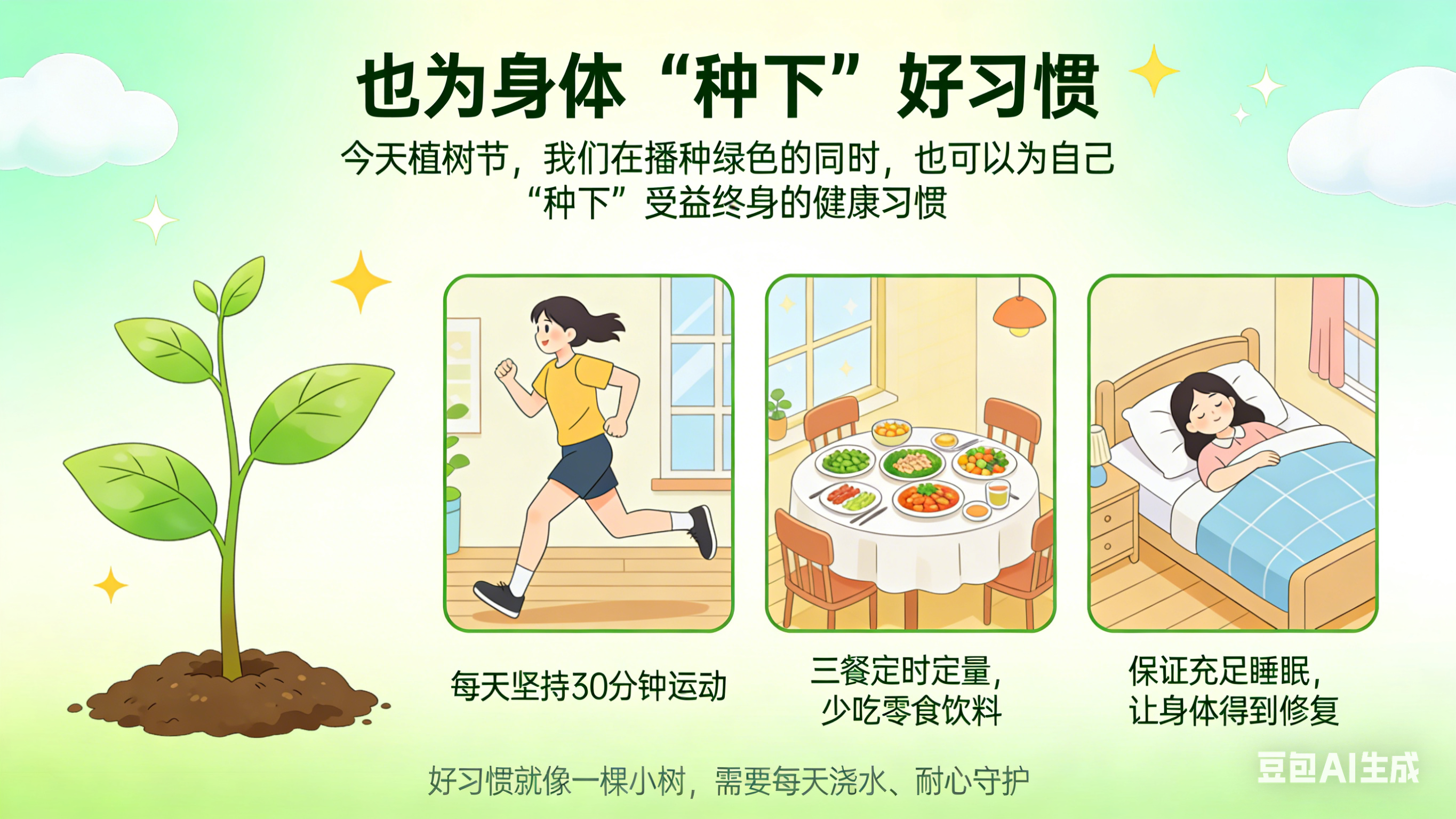 今天植树节,我们在播种绿色的同时,也可以为自己“种下”受益终身的健康习惯。每天坚持30分钟运动,既能强健体魄,又能释放压力;三餐定时定量,少吃零食饮料;保证充足睡眠,让身体得到修复。好习惯就像一棵小树,需要每天浇水、耐心守护。等到枝繁叶茂时,您会感谢当初的坚持。