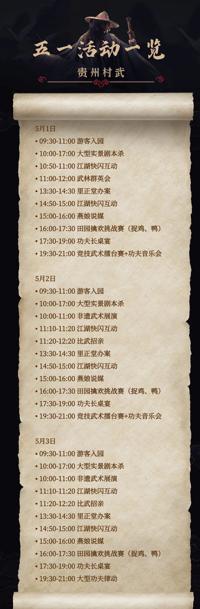 本次五一王牌亮点——“贵州村武”竞技武术大擂台重磅开打!各地武术好手齐聚一堂,强强对决、硬核比拼,每晚高燃赛事不断。同步上线功夫音乐会、功夫律动主题演出,动感旋律搭配热血功夫,点亮功夫村璀璨夜色,承包你的夜晚欢乐。