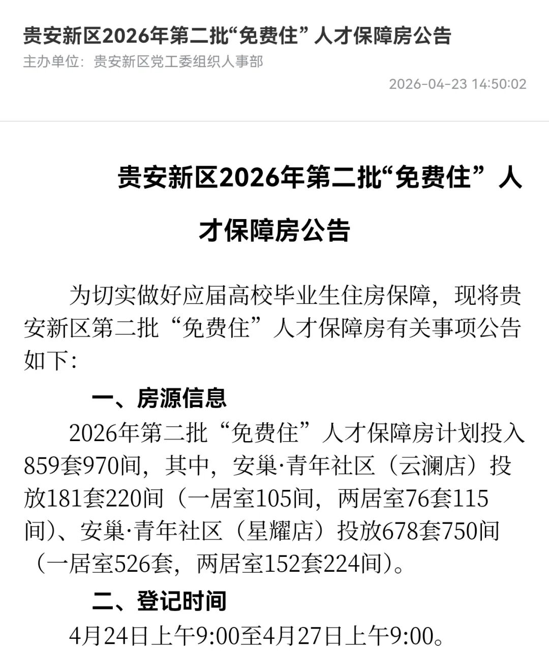 4月23日,贵安新区党工委组织人事部发布公告,2026年第二批“免费住”人才保障房全面启动申请工作,共计投放970间优质房源。线上申请通道将于4月24日9:00正式开启,至4月27日9:00截止,持续为应届高校毕业生解决住房难题,筑牢人才安居“暖心防线”。