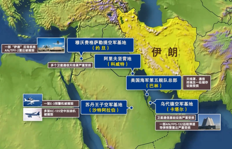 位于约旦的穆沃费格萨勒提空军基地的一部“萨德”反导系统AN/TPY-2雷达被摧毁;位于科威特的阿里夫坚营地多个卫星通信天线罩严重受损;