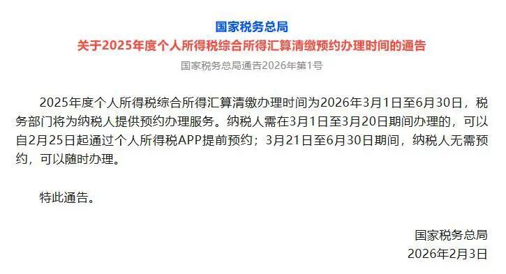 国家税务总局近日发布2026年第1号通告,明确2025年度个人所得税综合所得汇算清缴办理相关事宜,办理时间为2026年3月1日至6月30日,2月25日起正式开启预约办理服务,方便纳税人错峰申报、高效办税。