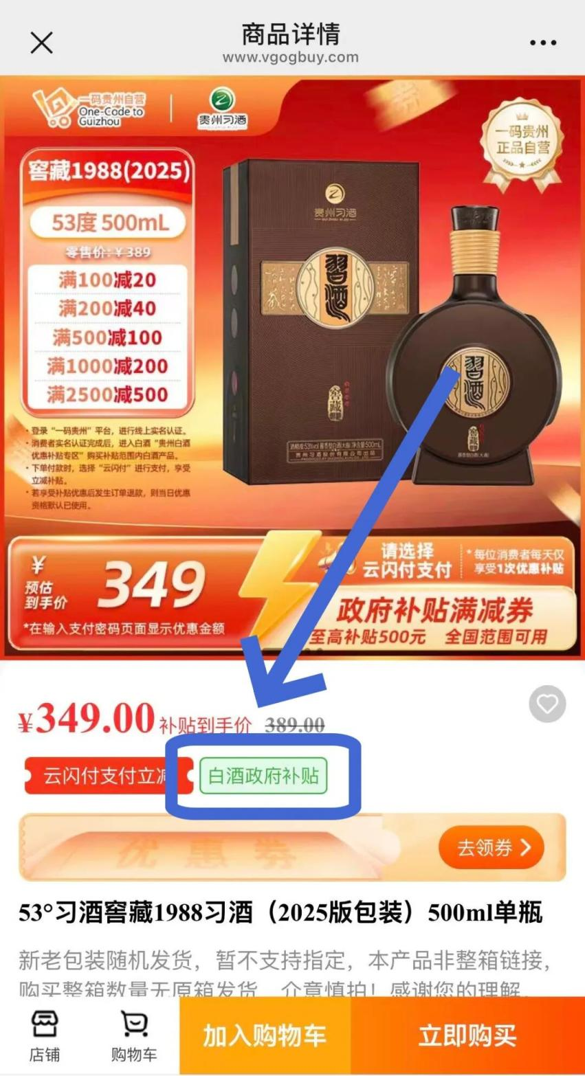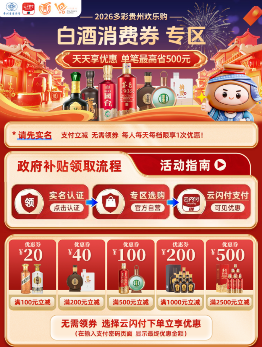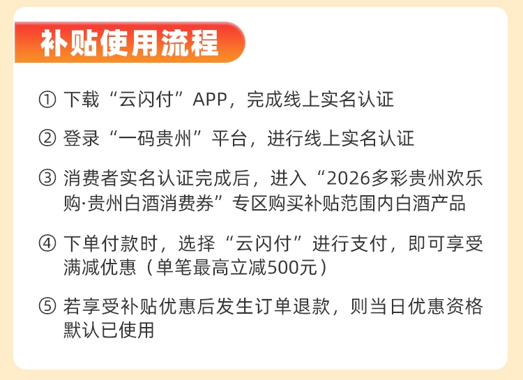 消费者需在“一码贵州”平台 及“云闪付”APP均完成实名认证后,在“一码贵州”平台内指定的“2026多彩贵州欢乐购·贵州白酒消费券”活动专区进行购物,该专区内所有带有“白酒政府补贴”专用标识的白酒产品均可享受优惠。