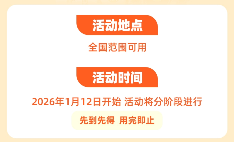 据悉,本次消费券活动将面向全国消费者开放。活动计划于2026年1月启动,并采用分阶段滚动投放的形式,所有补贴名额遵循“先到先得,用完即止”的原则。