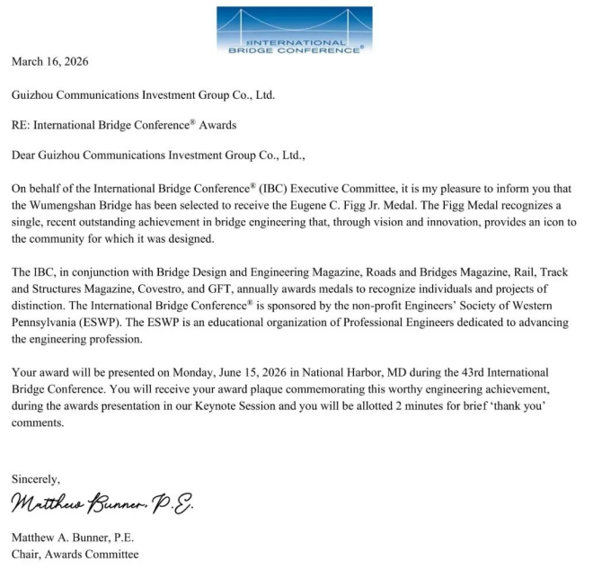 此次荣获尤金·菲戈奖,不仅是国际桥梁界对贵州交投集团精湛施工工艺和卓越管理水平的高度肯定,更是对国家卓越工程师团队——贵州交通山区峡谷桥梁建造技术团队技术实力的又一次印证。从峡谷深处到国际舞台,贵州交投集团接续攀登山区峡谷桥梁建造技术高峰,用实际行动诠释了中国建造的硬核实力,为世界山区峡谷桥梁建造提供更多更优的具有国际领先水平的“贵州交投样板”。