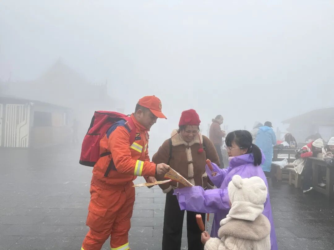 在普渡广场、红云金顶、蘑菇石等核心景点和人流密集区域,消防员们开展徒步巡防、动态执勤,每日往返数千级台阶,穿梭在山林步道与游客之间。巡逻途中,大家身兼数职:既是排查线路、商铺、观景台安全隐患的“安全员”,也是面对面提醒游客严禁野外用火、发放防火宣传资料的“宣传员”,更是为游客指路、搀扶老人小孩、提供应急帮助的“服务员”。队伍紧盯重点场所关键环节,在人流集中区域利用喇叭循环播放安全提示,通过“服务中宣传、宣传中服务”的模式,从源头消除火灾隐患。不少游客表示,看到消防员在身边巡逻,出游更安心、更踏实。