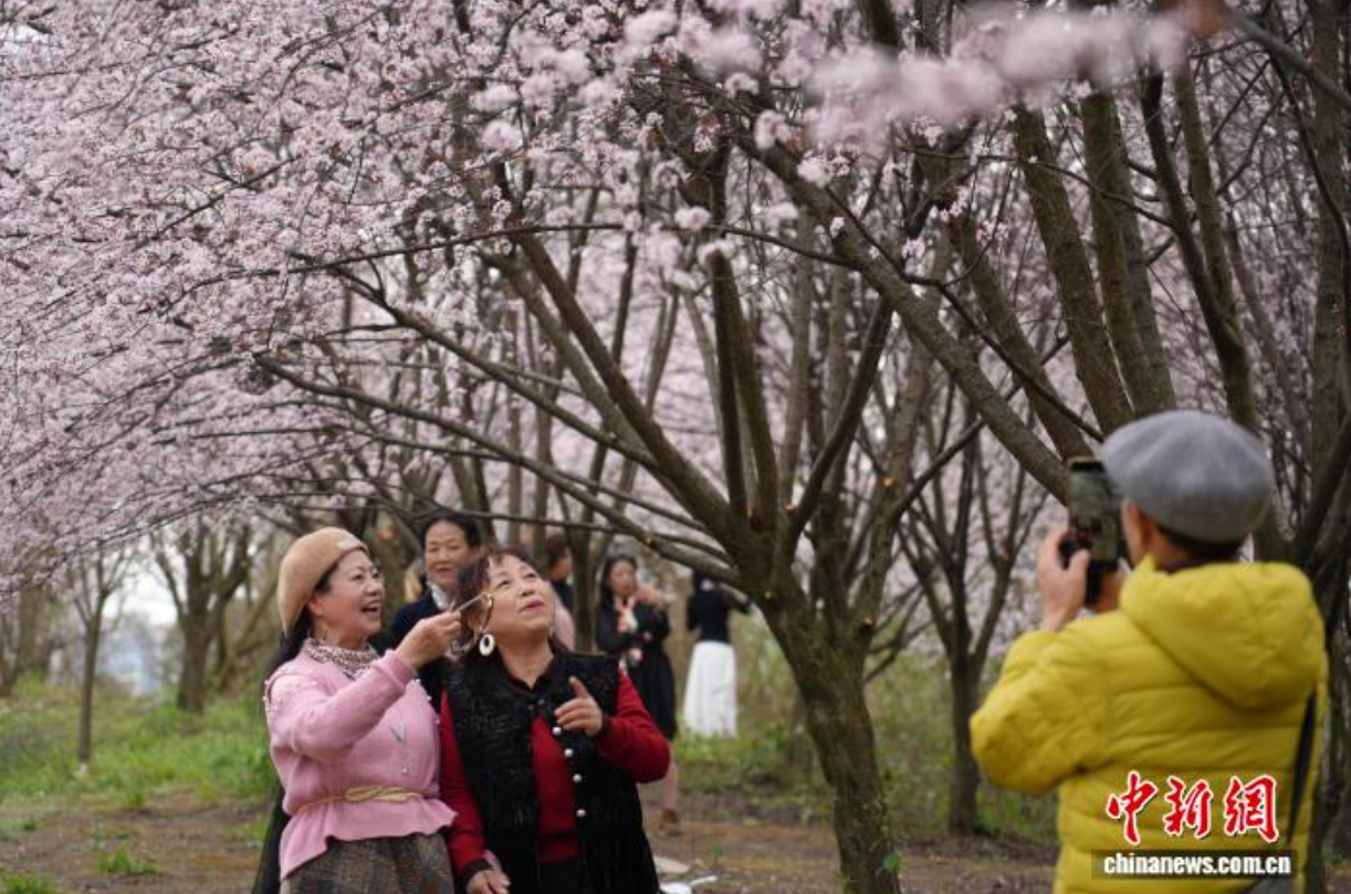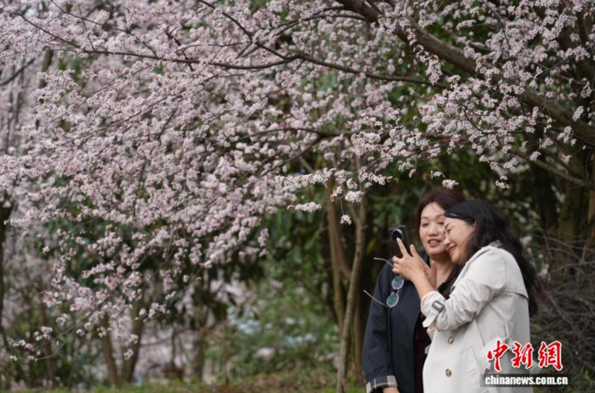 图为2月25日,民众在花树下拍照。石小杰 摄
