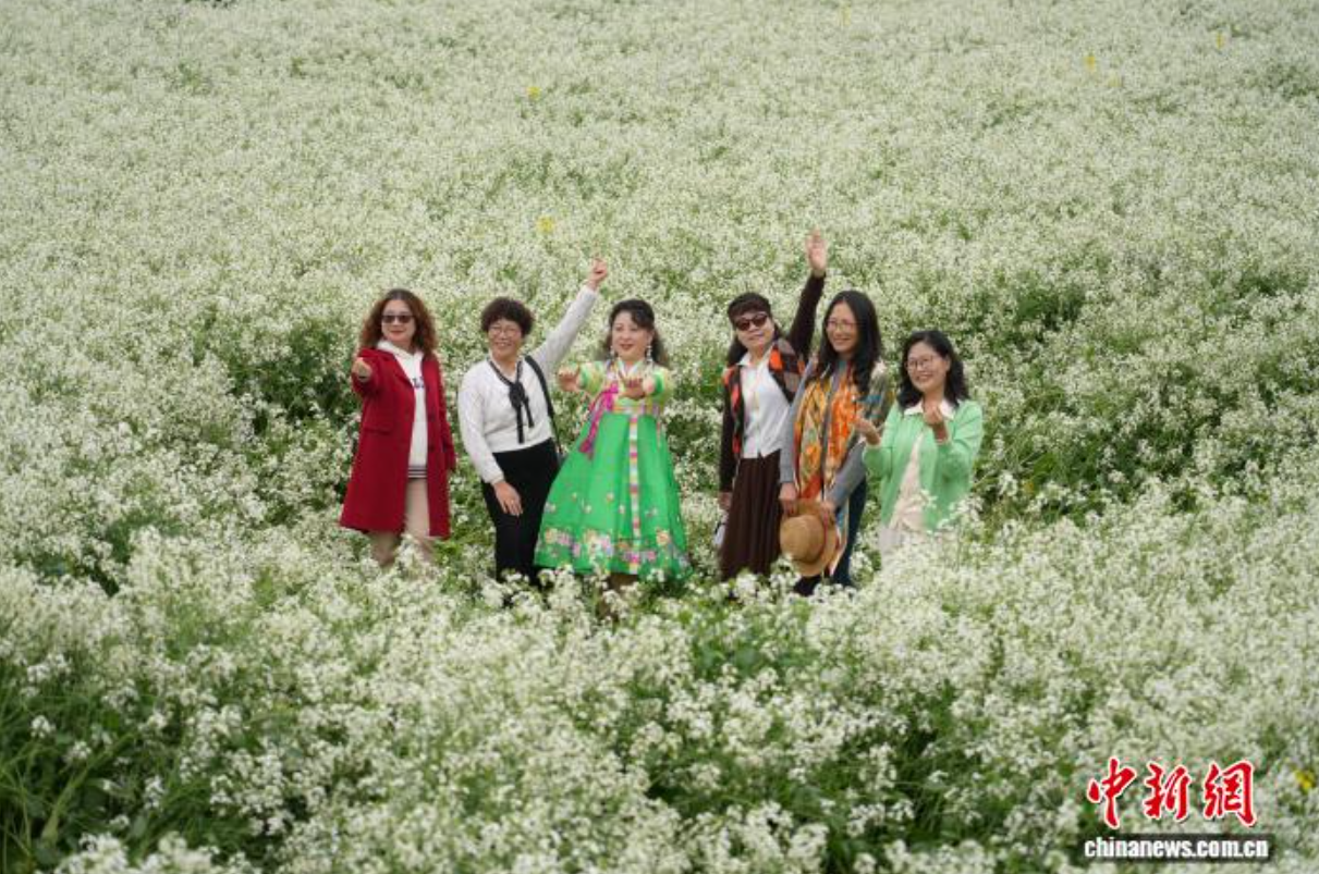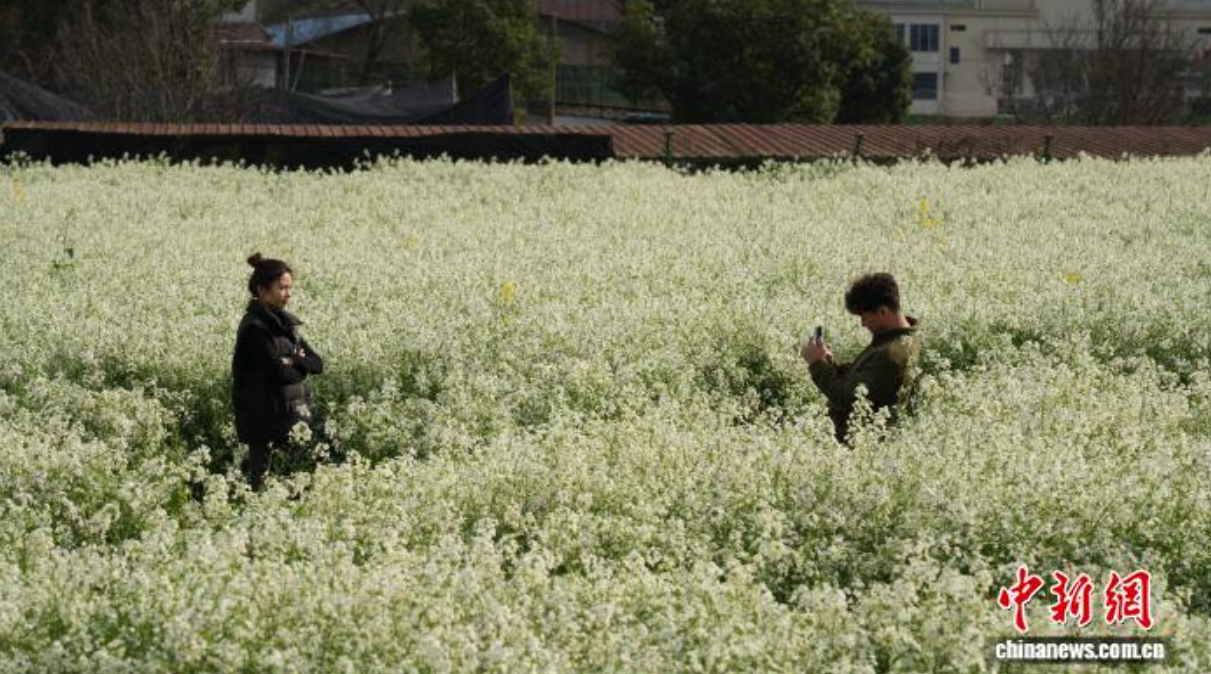 图为2月25日,民众在肥田萝卜花丛中拍照。石小杰 摄