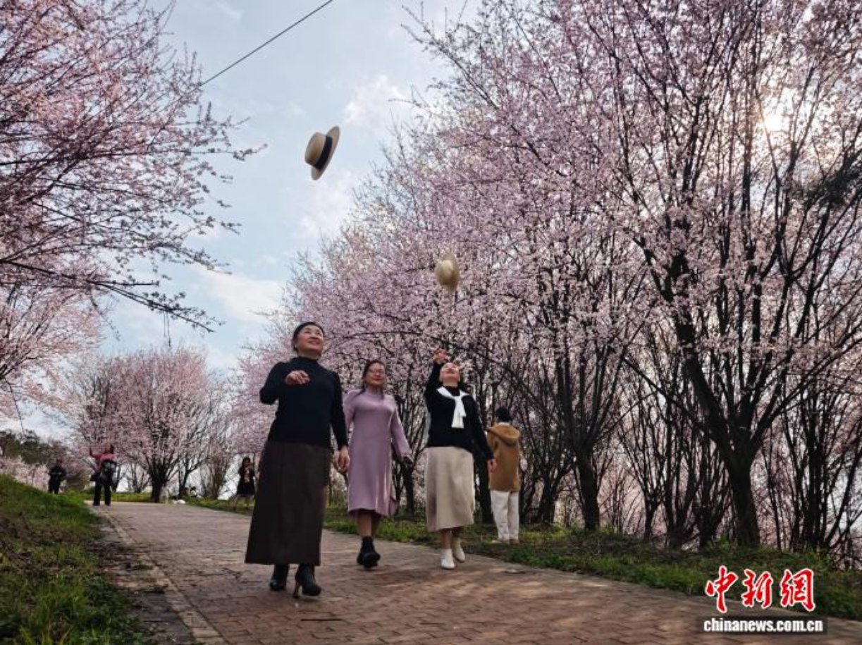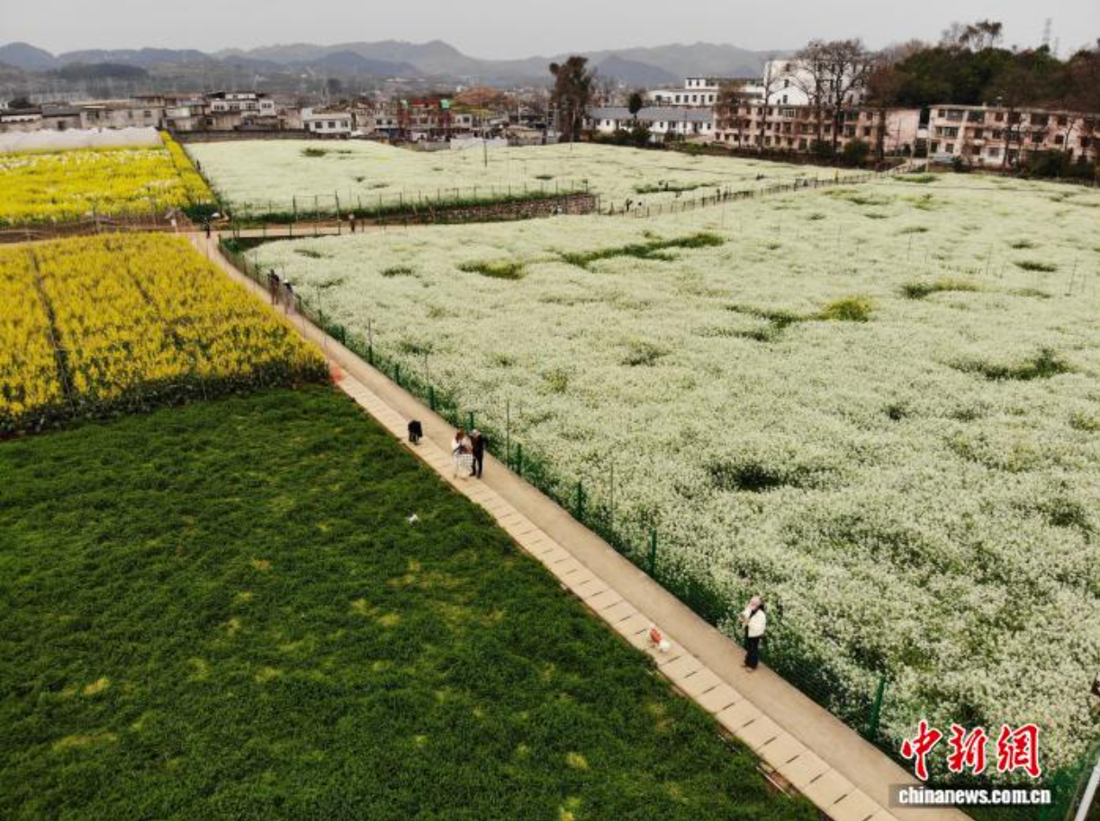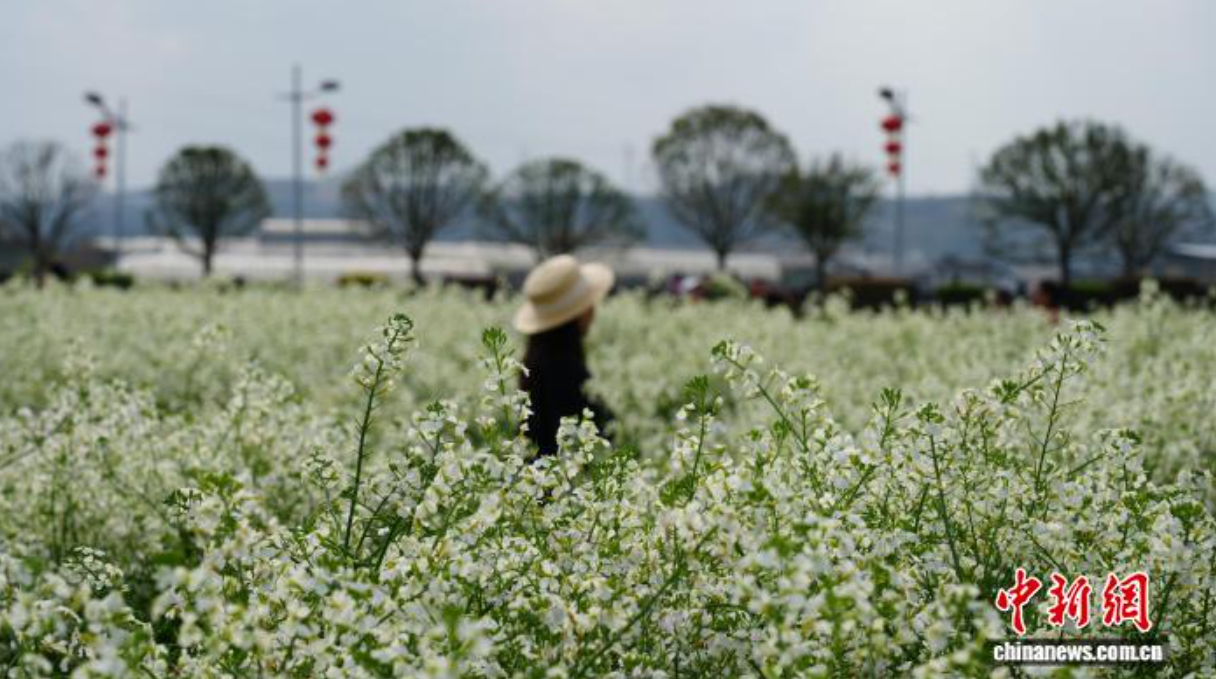 随着气温升高,2月25日,贵州省贵阳市花溪区桂香路附近的肥田萝卜、油菜、红叶李等迎来花期,绚烂开放。春花“争艳”吸引众多市民和游客前来踏青赏花,乐享春光。