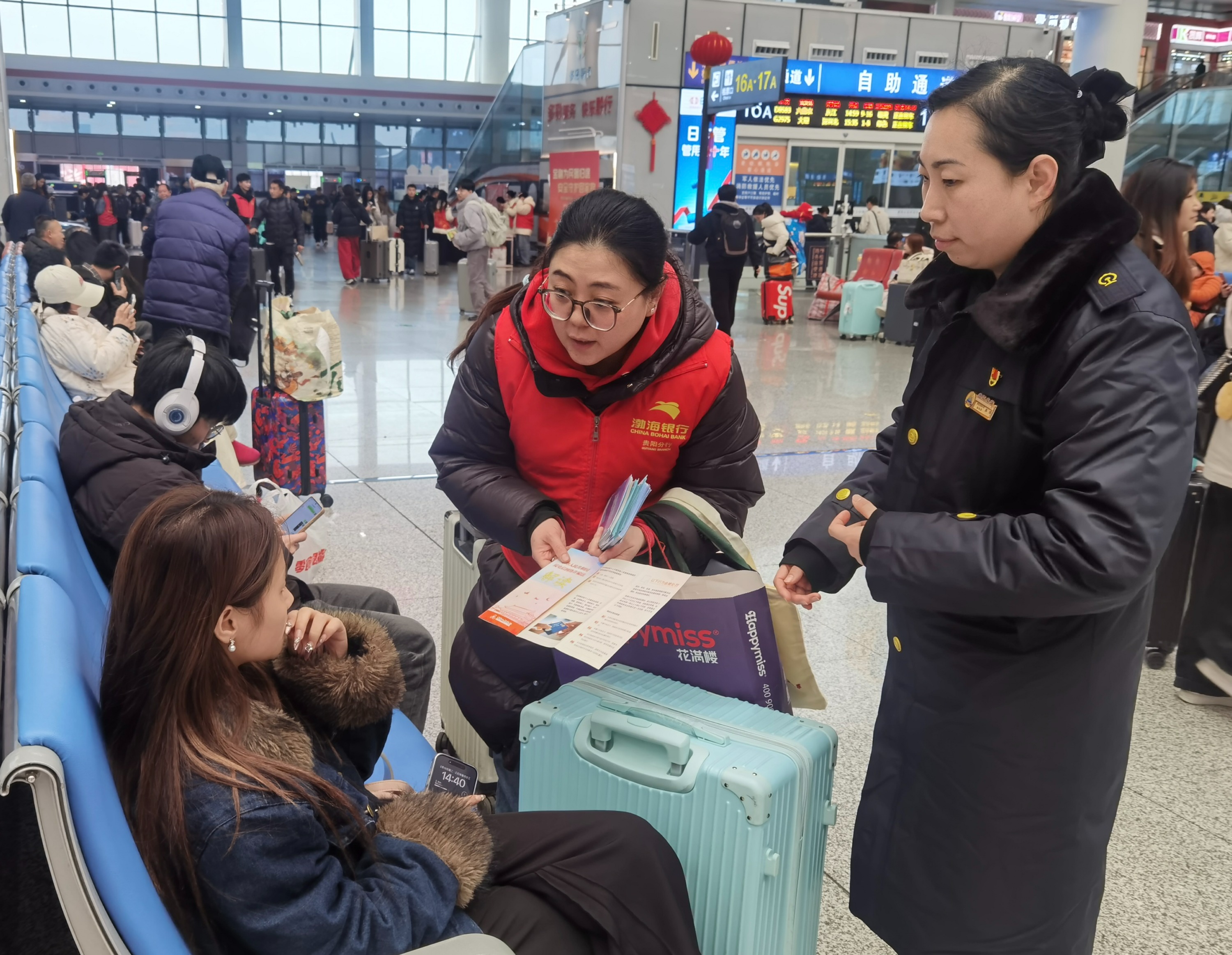 为全面提升公众防范电信网络诈骗意识,切实守护人民群众财产安全,近日,渤海银行贵阳分行在人民银行贵州省分行的指导下,联合贵阳车站、贵阳北站派出所,牵头组织多家金融机构在贵阳北站候车大厅,开展了“金融为民暖归途 安全守护回家路”主题反诈宣传活动。本次活动以春运为媒,融合银警专业力量与趣味互动形式,为返乡旅客送上了一份特殊的“平安礼”。
