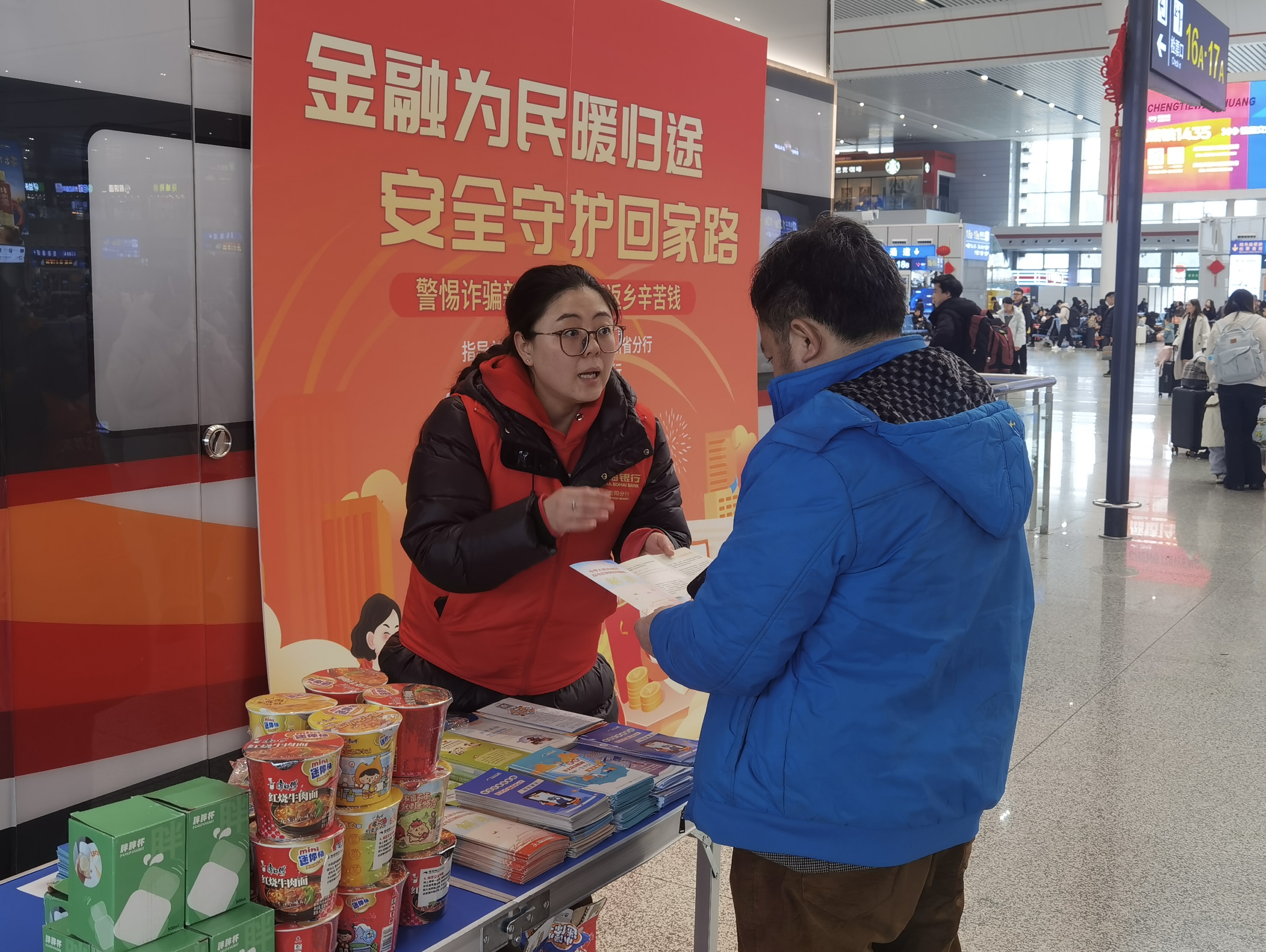 活动现场,橙黄主色调的背景板与复兴号、铁轨交相辉映,“警惕诈骗新套路”等警示标语格外醒目。金铃铛宣传员们穿梭在候车旅客间,以“移动微宣讲”、乡音讲解典型案例、趣味问答等方式,生动普及购票陷阱、假冒客服等反诈知识,并发放印有防诈口诀的方便面、水杯等定制礼品,协助旅客下载国家反诈中心APP。旅客们纷纷在主题板前拍照打卡,直言“一看就懂,记得住”“回家路上还带了防骗年货”。正值春运客流高峰,活动累计发放宣传资料及纪念品3000余份,覆盖旅客超2000人次,切实增强了群众识诈、防诈能力。渤海银行表示,未来将持续探索喜闻乐见的反诈宣传模式,让“金融为民”暖彻归途。