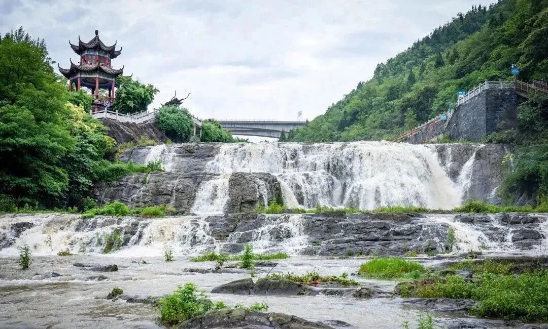 作为毕节八景之一的响水滩瀑布,是贵州省内唯一城市市区天然大瀑布。响水滩瀑布群由响水滩、龙潭和天然游泳池三个部分组成,每逢雨后,汹涌澎湃的河水从50米宽的悬崖上直泻黑龙潭,势如万马奔腾,轰隆隆地发出雷鸣之声,故有“响水轰雷”之称。