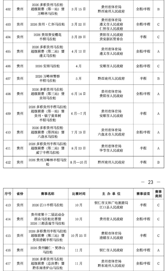 贵州16场绝美赛事定档!中国田协发布《2026年全国马拉松赛事目录》