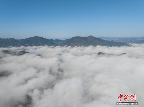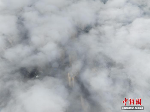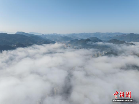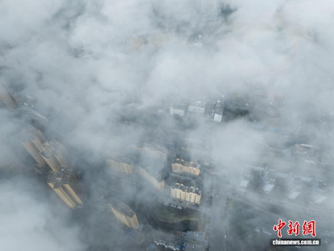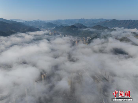 3月11日,贵州省务川仡佬族苗族自治县县城出现平流云景观,云雾在山峰与城市之间流动,高楼若隐若现,构成一幅山城相映的画面。