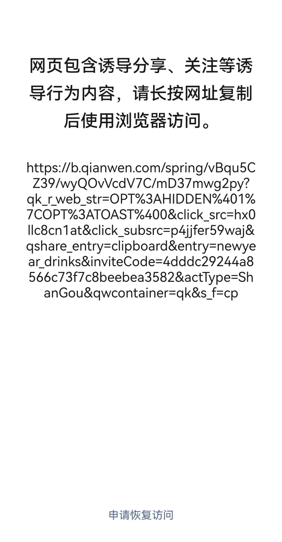 然而,继微信封杀自家腾讯元宝、百度文心助手后,千问的红包分享链接也被微信屏蔽,页面显示网页存在诱导或误导下载/跳转的内容,需要跳转第三方浏览器访问。同时,部分用户在千问APP点击分享活动至微信好友时,已自动改为复制口令形式。