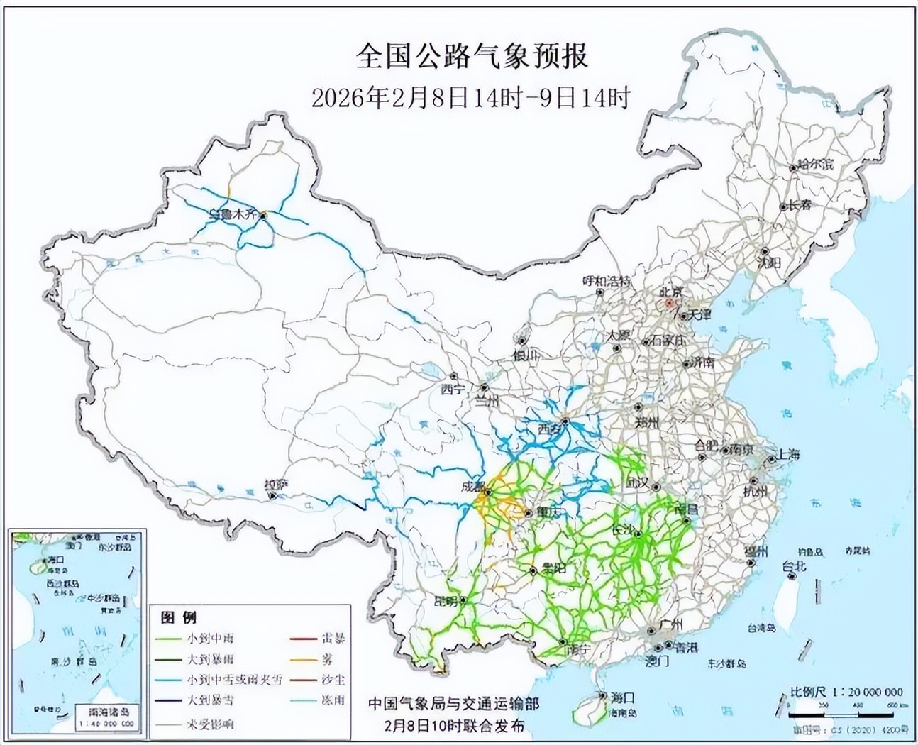 新疆北部、西藏东部、青海南部、甘肃南部、陕西中南部、湖北西部、重庆中北部、四川西部和北部等地部分地区有小雪或雨夹雪,新疆伊犁河谷、西藏东北部等地部分路段有中到大雪,发生道路湿滑、结冰、积雪的风险较高。