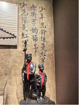 在井冈山革命博物馆的展厅中,有一组雕像格外引人注目。铜黑色的雕像上,竟系着两条鲜艳得略显突兀的红领巾。这背后有着什么样的故事呢?