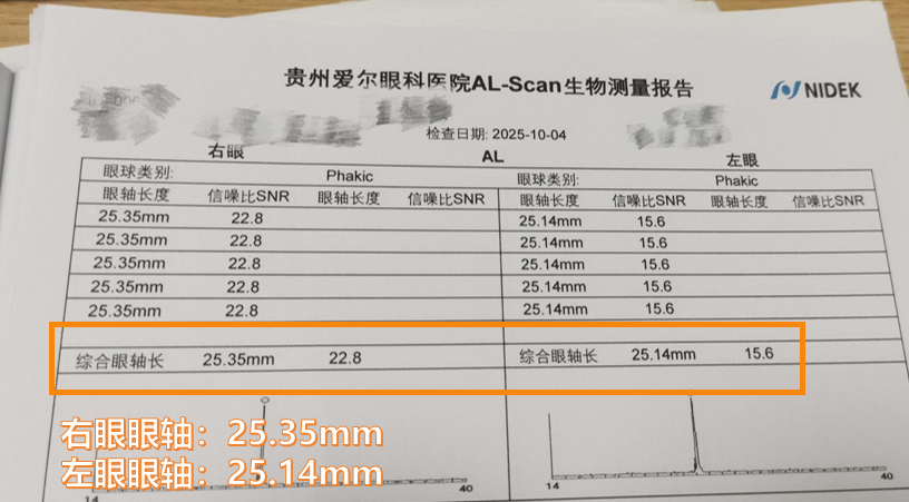 2025年10月复查数据亮眼:右眼从25.52mm降至25.35mm,左眼从25.15mm降至25.14mm——对比同龄未防控的孩子0.45-0.75mm的平均增长,小辰近视进展被“按住”还实现“逆向改善”。“现在上课不眯眼,运动也不用愁框架镜滑落!”小辰说。