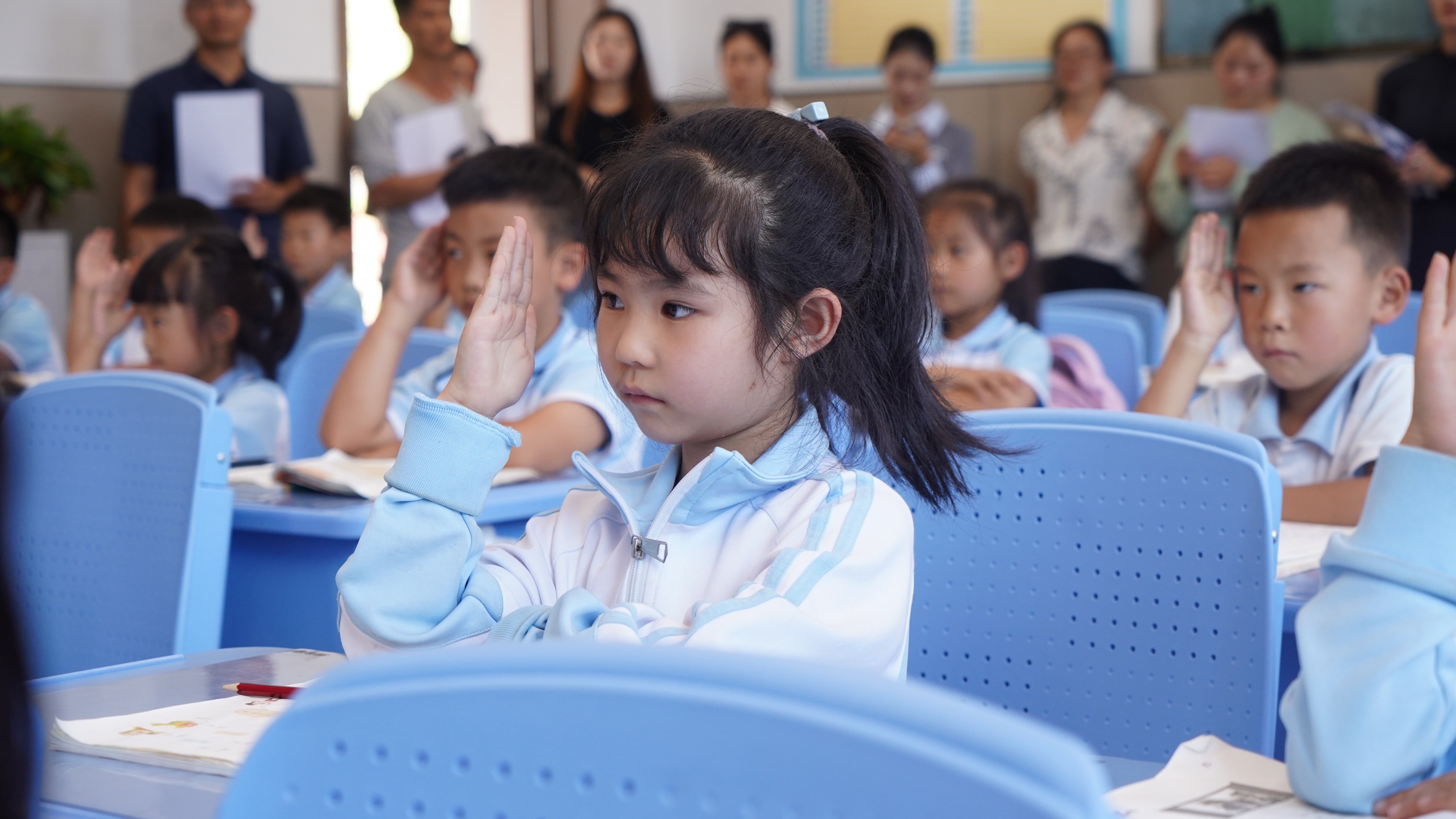 铃声响,速归位,口号独特,精神饱满。比赛过程中,各班以 10 分钟为限,完整模拟一堂课的流程。从班级口号展示、课前准备、师生问好、课堂表现、举手发言、朗读课文,再到书写姿势、下课礼仪、课间列队环节,每个班的表现都十分精彩,在细节中展现规则意识与集体荣誉感。让常规教学“点滴积累”,真正实现“以规范育品行”的育人目标。学校还组建了由家长代表共同参与的评委团队,对比赛中的九个模块实时打分,不仅让评分视角更加公平全面,也让家长们直观看到孩子们在校园的优秀表现,逐渐形成家校共育,让“习惯养成”从校园延伸至每个家庭中。
