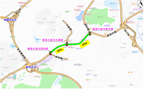 优化后,新添大道(四光路-航天路)路段双向不停车通过,其中,四光路至航天路方向行程时间由157秒缩短至89秒,行驶速度从23.8km/h提升至40km/h;东往西行程时间由118秒缩短至113秒,行驶速度从33.5km/h提升至35km/h。