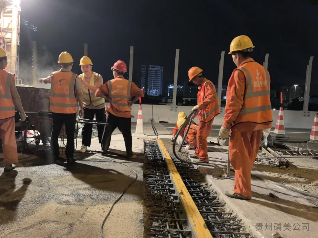 随着凌晨的到来,各项施工环节有条不紊地推进。施工人员先是精准挖掘受损部位,随后依次进行扎筋、焊接、铺垫等作业,每一道工序都严格遵循施工规范。至凌晨5点,现场清理及新桥梁伸缩缝钢构装置安装工作顺利完成,为磷美修补新材料的应用做好了充分准备。