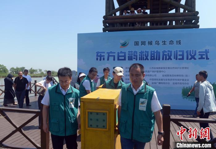 四只东方白鹳在江苏盐城湿地珍禽国家级自然保护区集中放飞。
